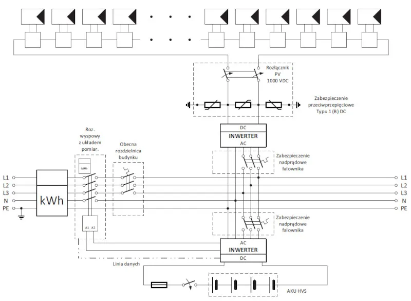 Poznaj schemat podłączenia paneli fotowoltaicznych w systemie on-grid z akumulatorami - krok po kroku od montażu paneli PV, poprzez dobór i konfigurację falownika, magazynu energii po zabezpieczenia całej instalacji.